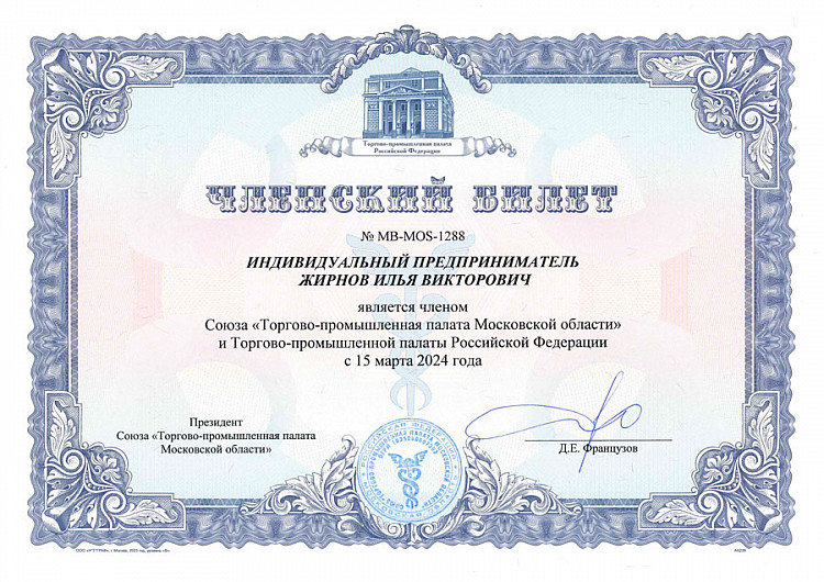 Компания ТЕРМОЛЕСПРОМ является членом Союза "Торгово-промышленная палата Московской области" и Торгово-промышленной палаты Российской Федерации с 15 марта 2024 года. ЧБ № МВ-МОS-1288