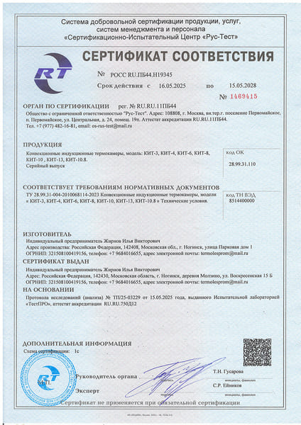 Конвекционные индукционные термокамеры моделей КИТ-3, КИТ-4, КИТ-6, КИТ-8, КИТ-10, КИТ-13, КИТ-10.8 прошли сертификацию и соответствуют требованиям технических регламентов ТР ТС 004/2011, ТР ТС 010/2011 и ТР ТС 020/2011.